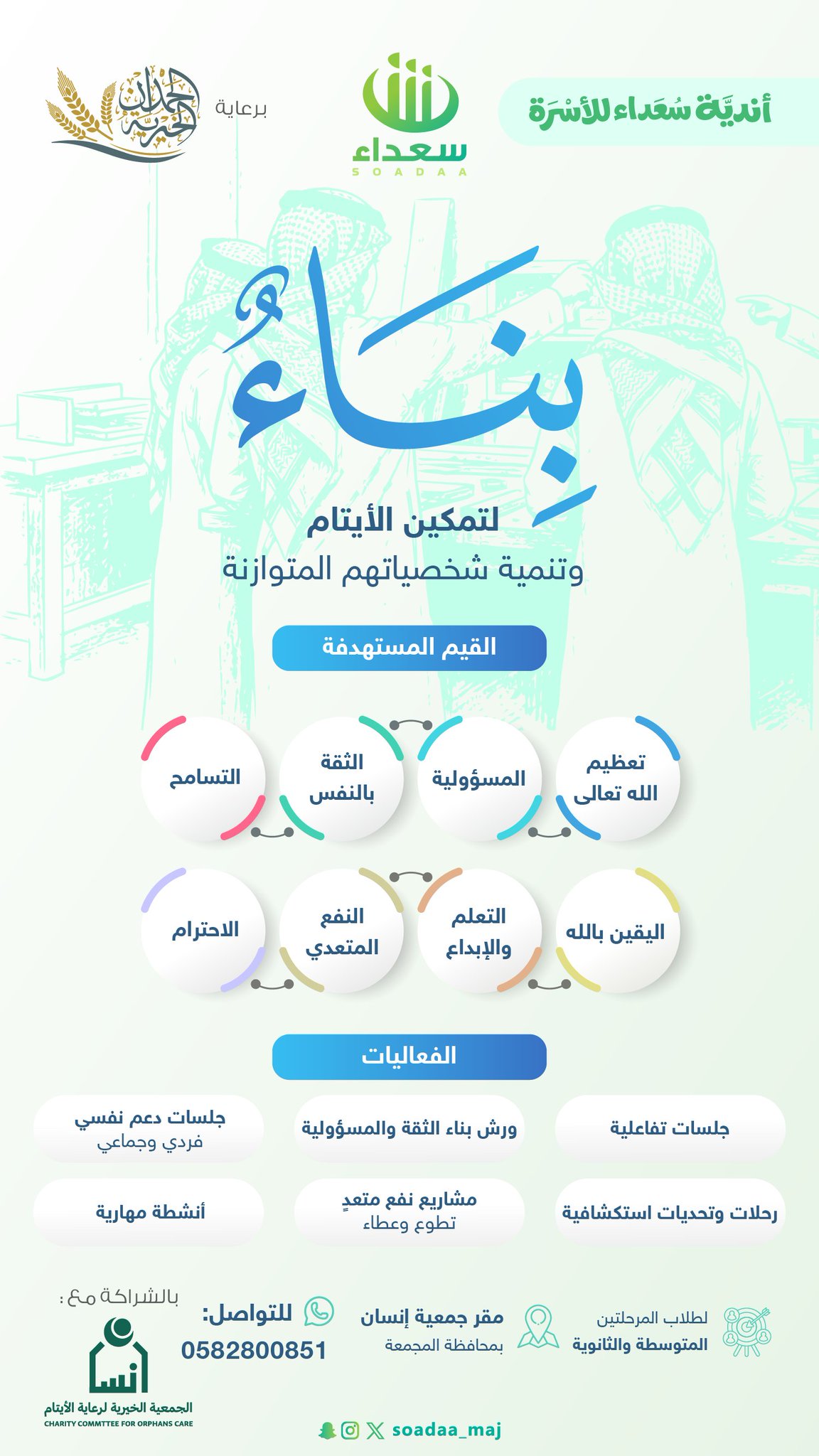 مركز الإرشاد الأسري التابع لجمعية سعداء بمحافظة المجمعة يقدم الخدمات التالية : ( استشارات أسرية . زوجية . تربوية . شبابية . نفسية . إصلاح أسري مباشر )