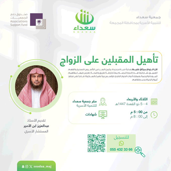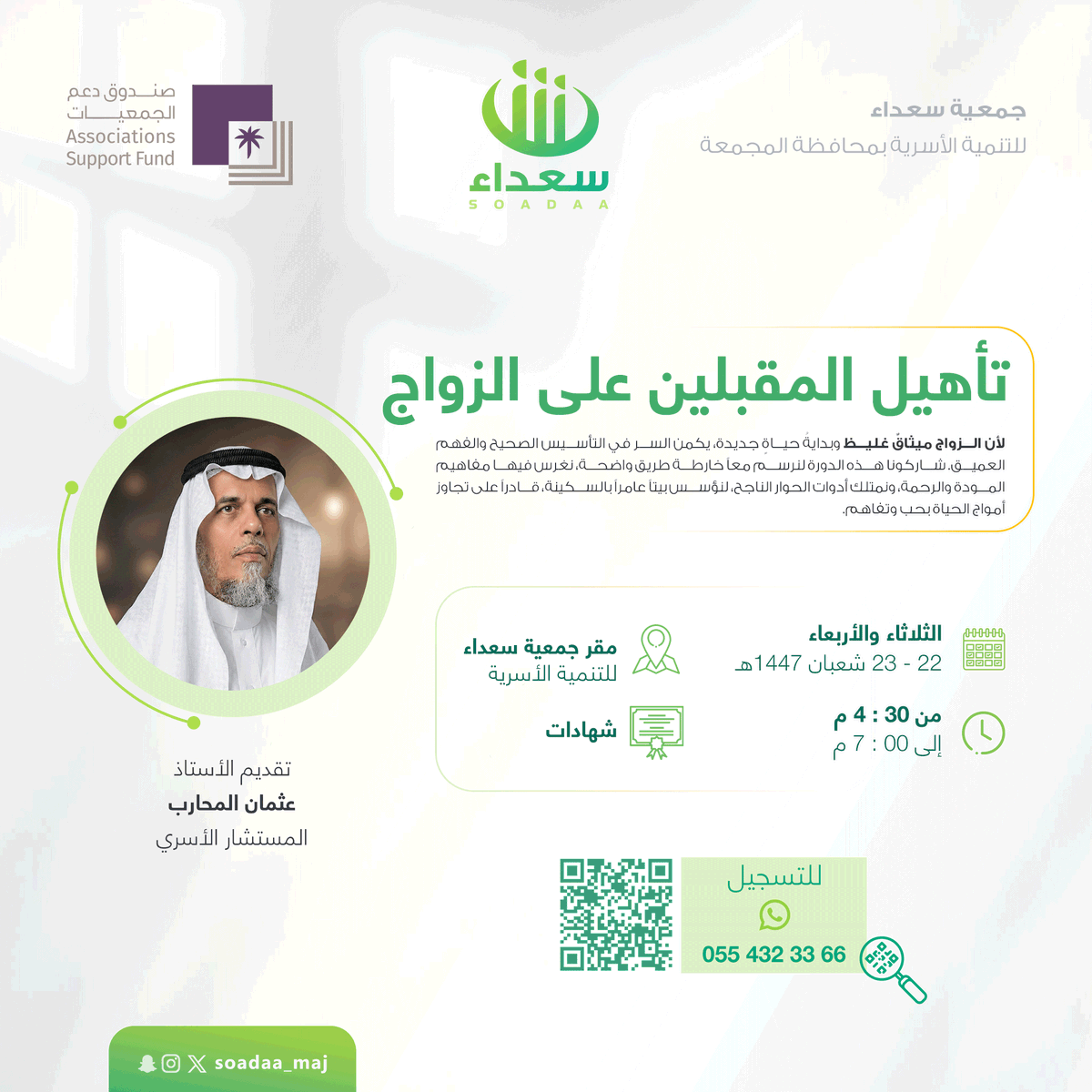 دورات تدريبية تهدف لتطوير مهارات المقبلين على الزواج نتناول فيها طبيعة وعادات ومفاهيم الزواج في المجتمع السعودي والفروقات بين الرجل والمرأة وأيام الملكة وترتيبات ما قبل العرس ويوم العرس وفيتامينات لصحة العلاقة بين الزوجين .