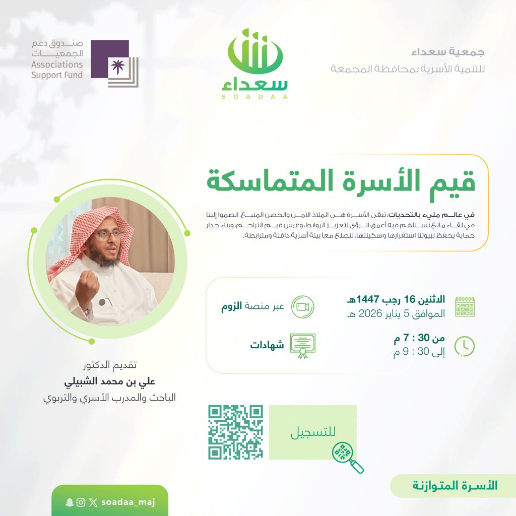 الأسرة هي الملاذ الأمن والحصن المنيع انضمو إلينا في لقاء ماتع نستلهم فيه أعمق الرؤى لتعزيز الروابط وغرس قيم التراحم وبناء جدار حماية يحفظ لبيتونا استقرارها وسكينتها للتسجيل :