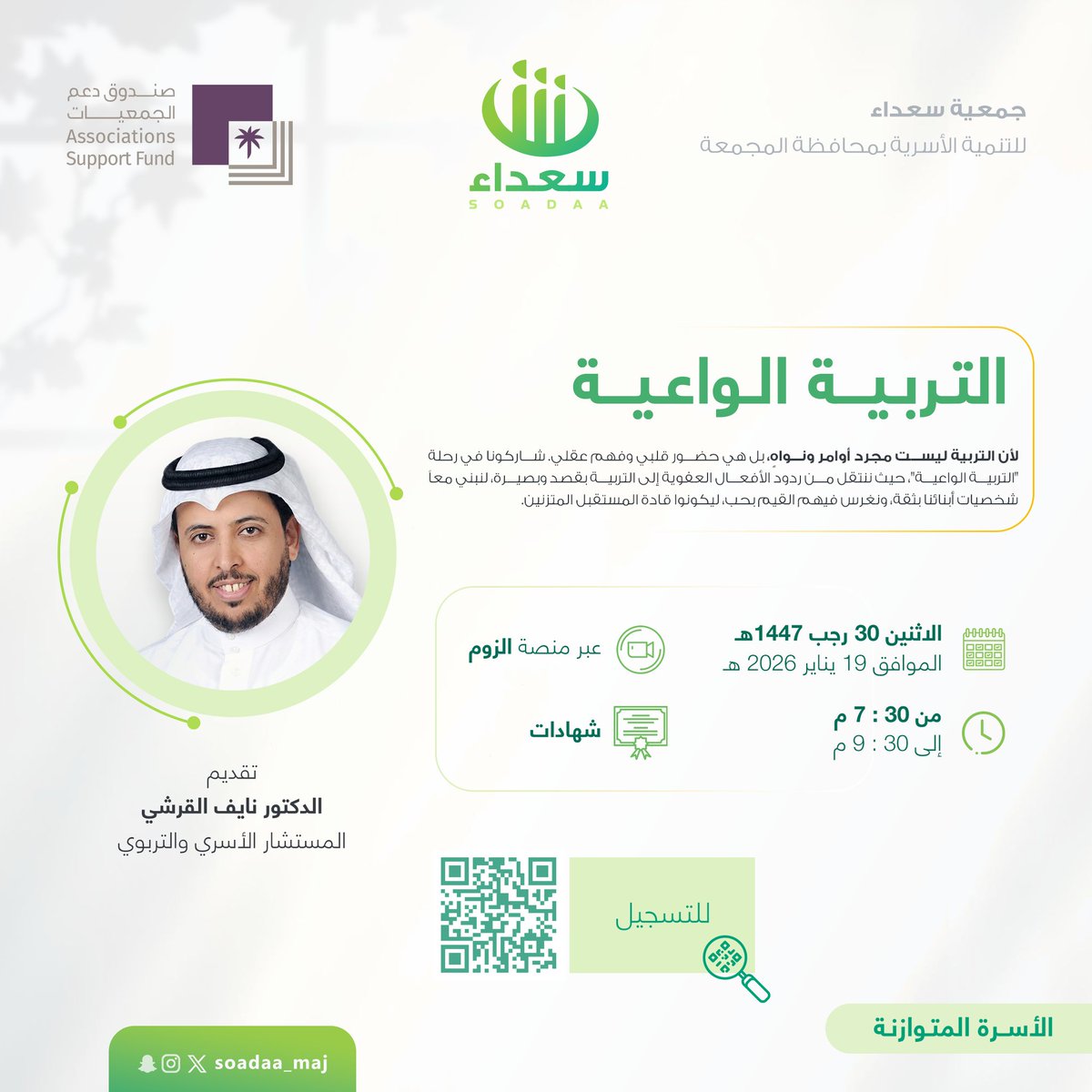 تدعوكم جمعية سعداء لحضور دورة التربية الواعية بتقديم د. نايف القرشي يوم الاثنين 30 /7/ 1447هـ ا...